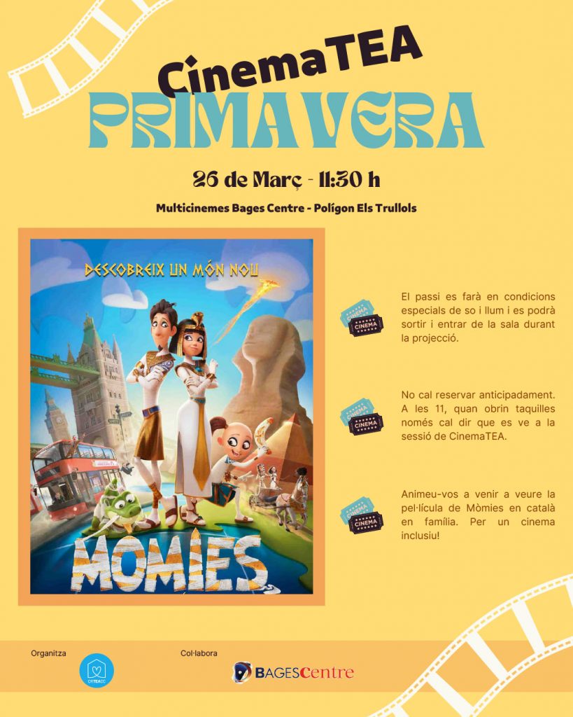 El proper diumenge 26 de març, als Multicinemes Bages Centre de Manresa farem la sessió del CinemaTEA de primavera. La pel·lícula que s’ha triat és la de Mòmies. Esperem que la gaudiu petits i grans…