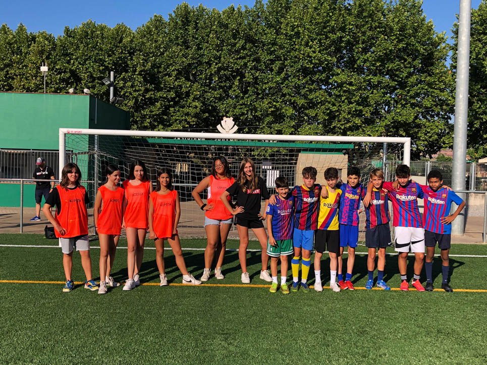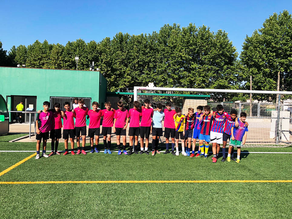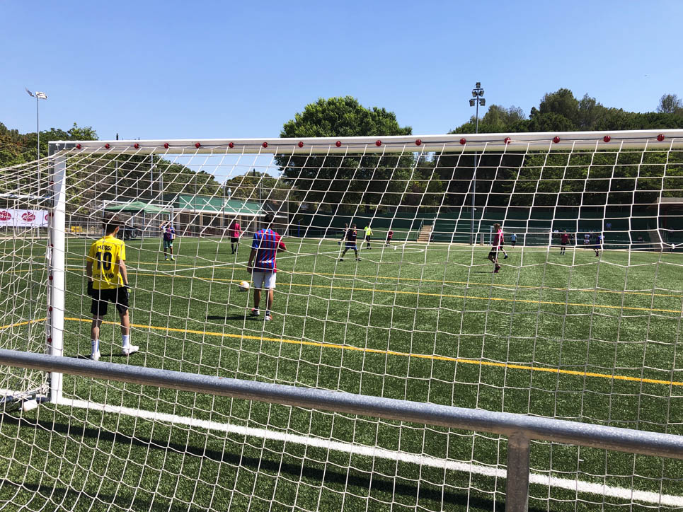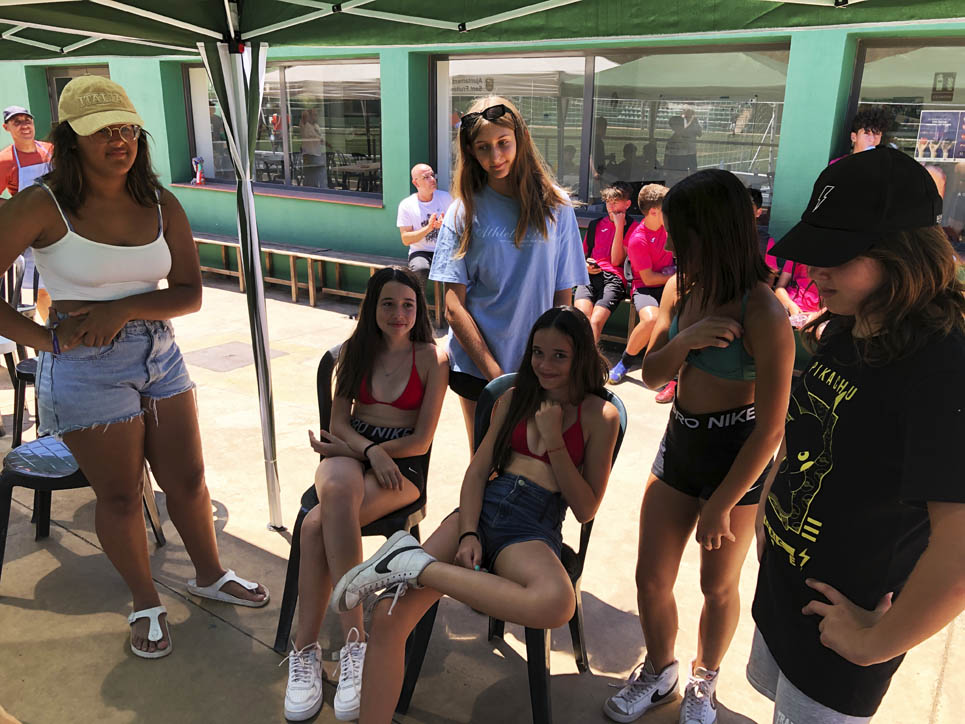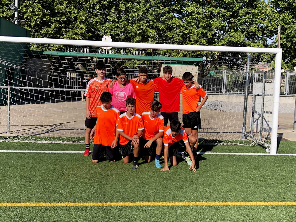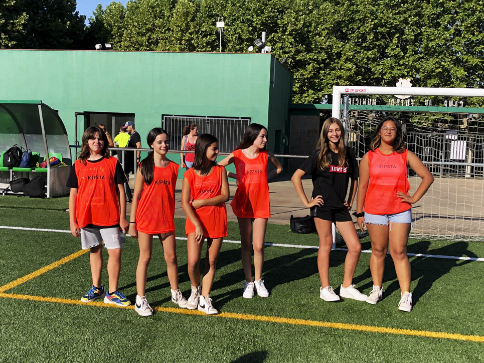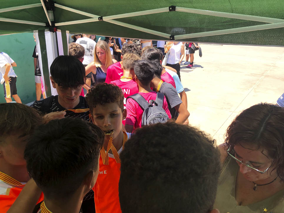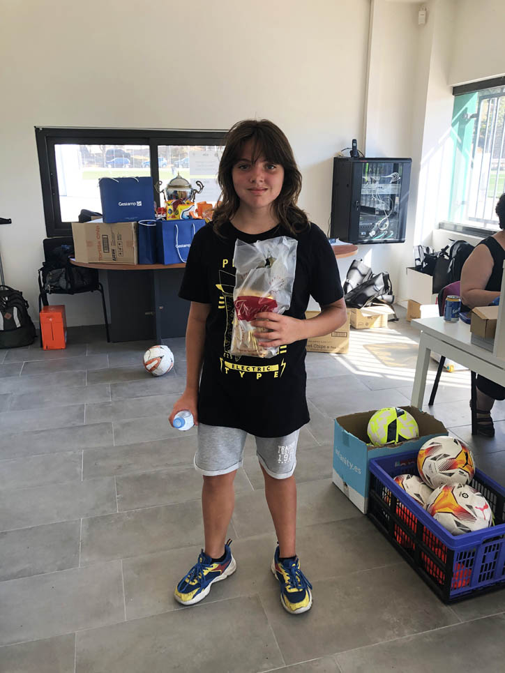 I ara ja comença tot. A 2/4 de 9 en punt, l’àrbitre, en Jordi, dona permís per encetar el torneig. S’enfronten l’únic equip de noies (Les xules del barri) contra Los Pajeros. Val a dir que les noies van estar de pega: una va agafar la COVID i no va poder venir, dues no es van presentar i de 8 van quedar en 5, però la filla d’un dels voluntaris, la Marta, va ser valenta i es va oferir per jugar amb elles. I va ser l’única noia que va marcar un gol contra els Coca Juniors!!! Bravo, noies!!!! No duien equip, jugaven amb ganes però van perdre el primer partir per 17 a 0. No es van acovardir i van continuar fins al final, tot i no guanyar cap partit. La majoria d’ells i elles són de la mateixa aula de La Salle i es van fer una foto junts. Com que van quedar eliminades del triangular van poder anar a fer un bany a la piscina abans de recollir els premis. Se l’havien ben guanyat.