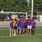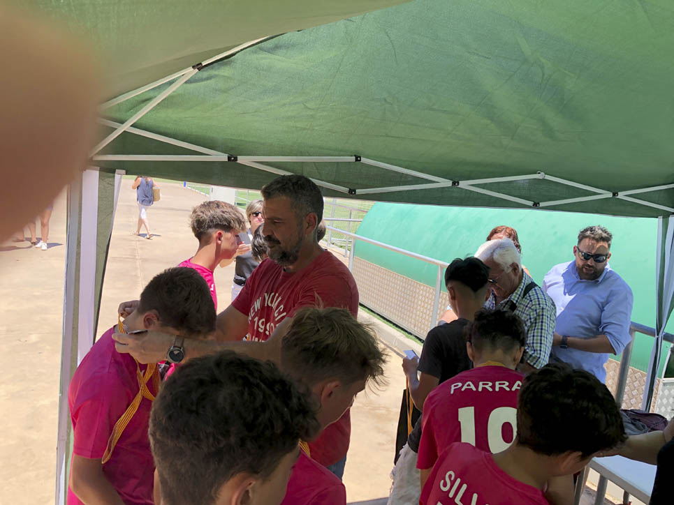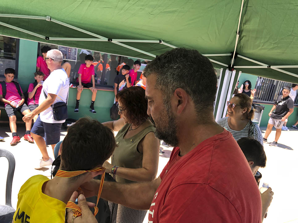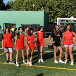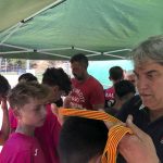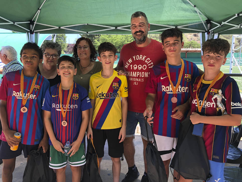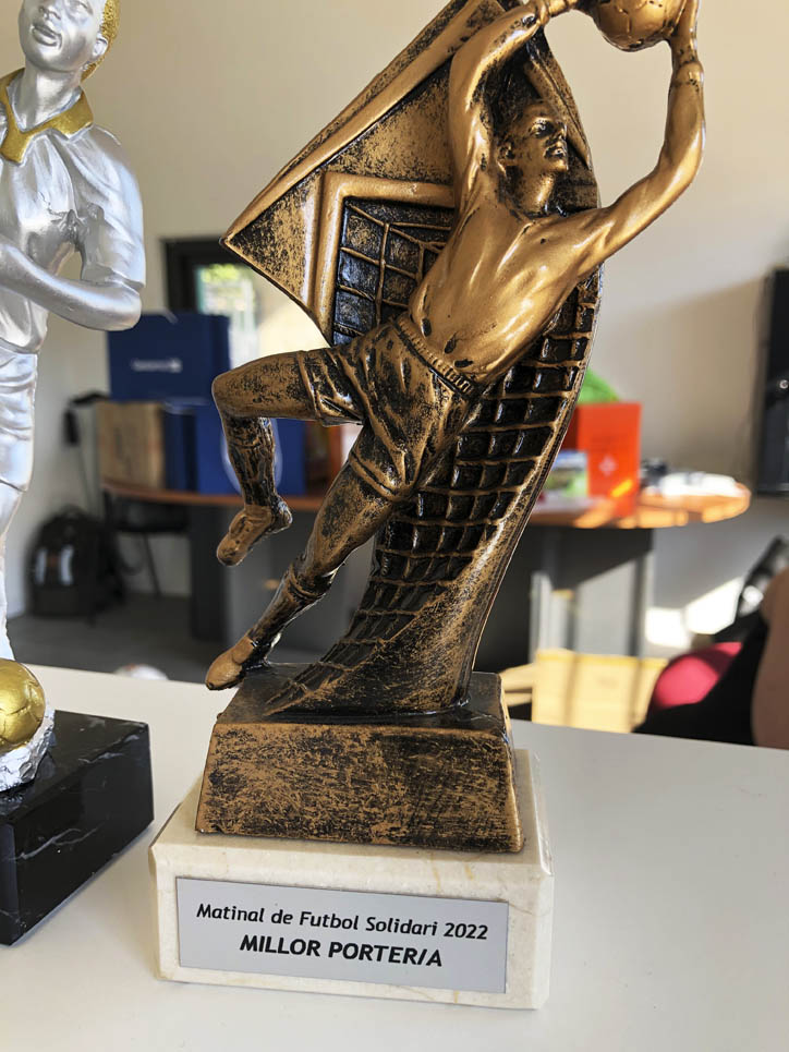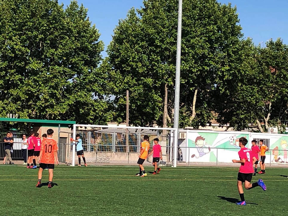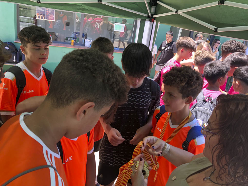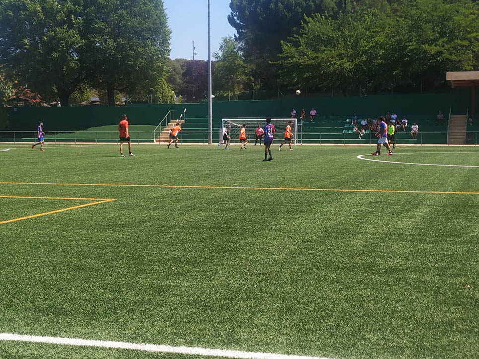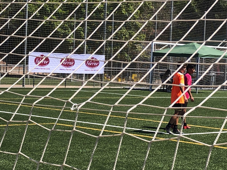 I ara ja comença tot. A 2/4 de 9 en punt, l’àrbitre, en Jordi, dona permís per encetar el torneig. S’enfronten l’únic equip de noies (Les xules del barri) contra Los Pajeros. Val a dir que les noies van estar de pega: una va agafar la COVID i no va poder venir, dues no es van presentar i de 8 van quedar en 5, però la filla d’un dels voluntaris, la Marta, va ser valenta i es va oferir per jugar amb elles. I va ser l’única noia que va marcar un gol contra els Coca Juniors!!! Bravo, noies!!!! No duien equip, jugaven amb ganes però van perdre el primer partir per 17 a 0. No es van acovardir i van continuar fins al final, tot i no guanyar cap partit. La majoria d’ells i elles són de la mateixa aula de La Salle i es van fer una foto junts. Com que van quedar eliminades del triangular van poder anar a fer un bany a la piscina abans de recollir els premis. Se l’havien ben guanyat.