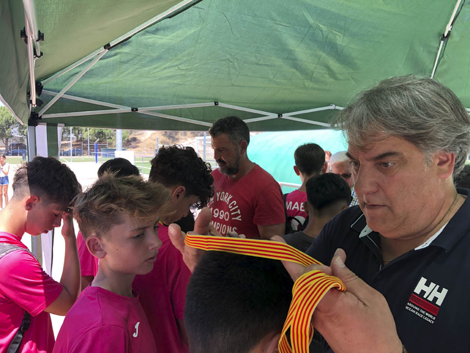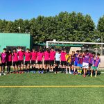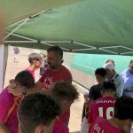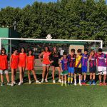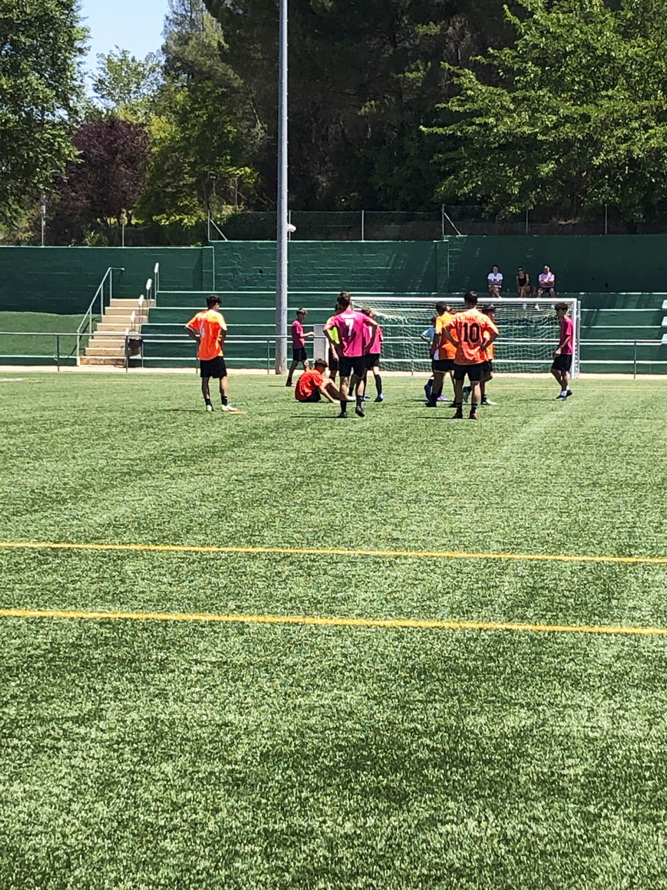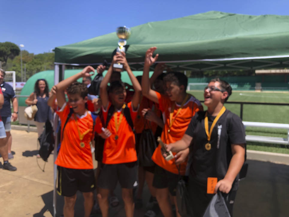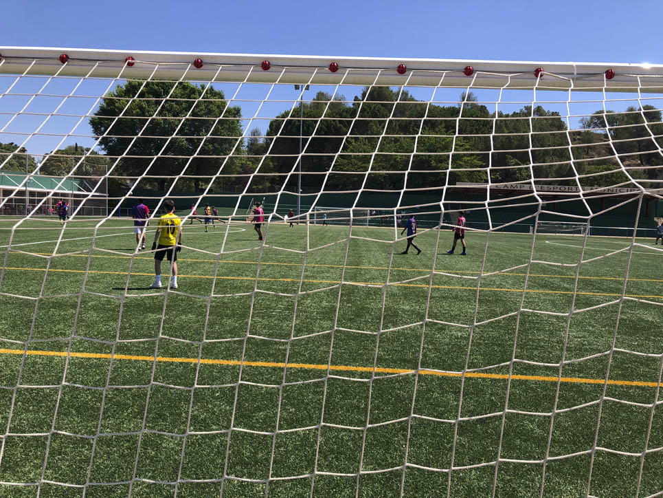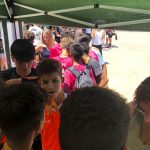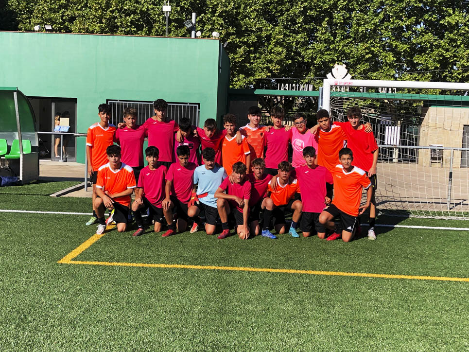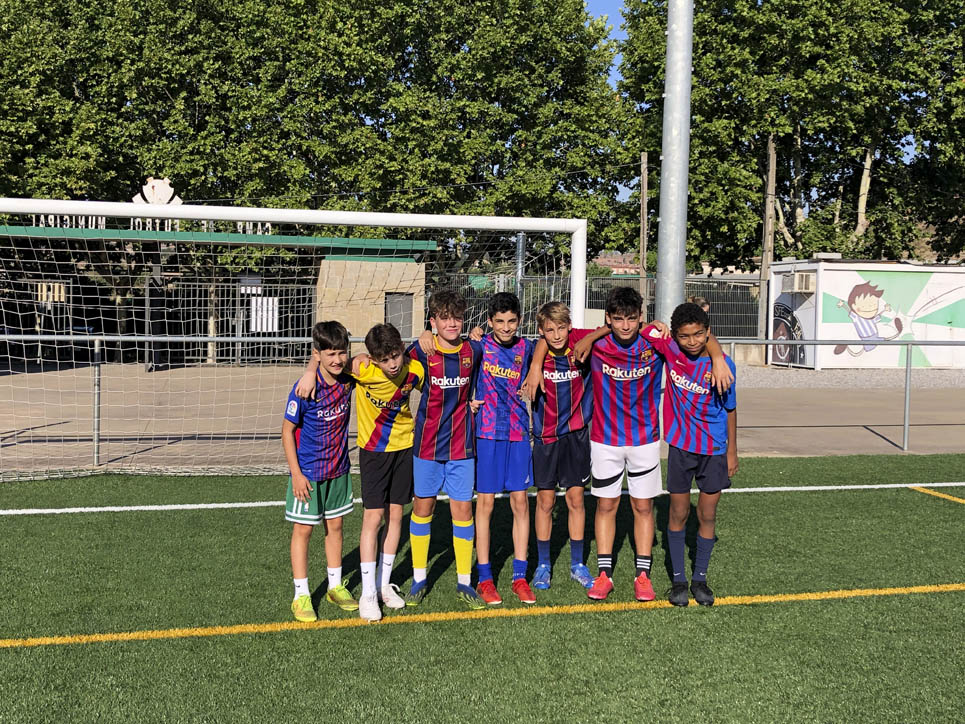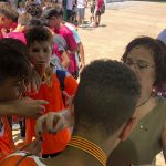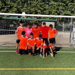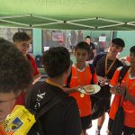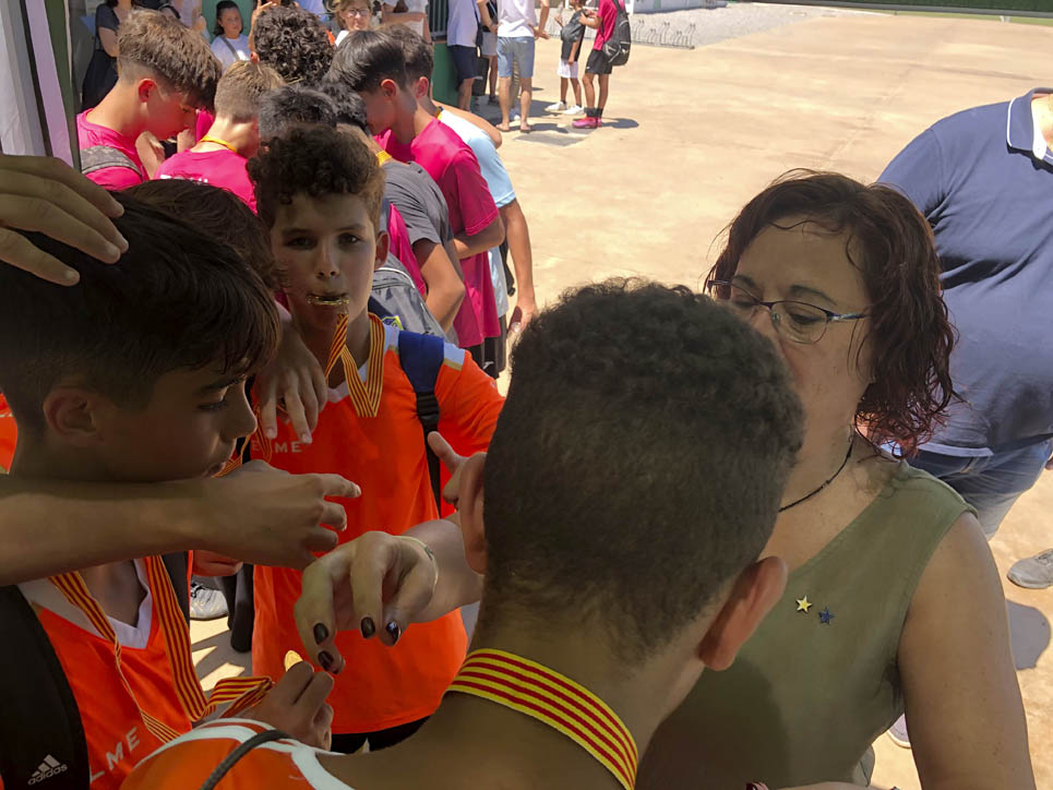 I ara ja comença tot. A 2/4 de 9 en punt, l’àrbitre, en Jordi, dona permís per encetar el torneig. S’enfronten l’únic equip de noies (Les xules del barri) contra Los Pajeros. Val a dir que les noies van estar de pega: una va agafar la COVID i no va poder venir, dues no es van presentar i de 8 van quedar en 5, però la filla d’un dels voluntaris, la Marta, va ser valenta i es va oferir per jugar amb elles. I va ser l’única noia que va marcar un gol contra els Coca Juniors!!! Bravo, noies!!!! No duien equip, jugaven amb ganes però van perdre el primer partir per 17 a 0. No es van acovardir i van continuar fins al final, tot i no guanyar cap partit. La majoria d’ells i elles són de la mateixa aula de La Salle i es van fer una foto junts. Com que van quedar eliminades del triangular van poder anar a fer un bany a la piscina abans de recollir els premis. Se l’havien ben guanyat.