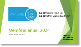 CR TEA CC, entitat sense ànim de lucre, va néixer fa 10 anys, es va constituir el 2012 i va inaugurar local el març del 2013 a Manresa, per donar recursos i ajuts davant dels interrogants i preocupacions que pateixen els pares quan reben un diagnòstic de TEA en el seu fill/a. Una mare i una psicòloga es van presentar per separat al concurs d’idees “UOC & PLUGGED” i allà es van conèixer i van unir els seus esforços per crear el CR TEA CC.